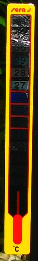Термометр-наклейка от фирмы Sera. И это его нормальное состояние. Он показывает примерно 27 градусов цельсия.